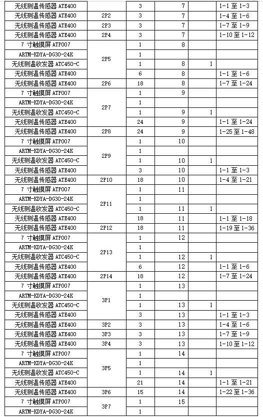本杭州蕭山國際機場三期擴建工程項目使用無線無源測溫傳感器共計12366只,無線測溫收發器共計471只,電源模塊共計471只,觸摸屏共計471只。詳細配置方案和安裝情況如下表。