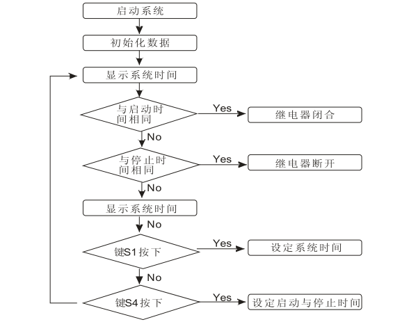 系統(tǒng)時間以及開啟與關閉時間的設定,系統(tǒng)時間與開啟或關閉時間相同時繼電器、蜂鳴器和指示燈工作狀態(tài)的管控。系統(tǒng)程序流程如圖4所示。