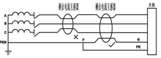 對于TN-C系統,不能采用剩余電流繼電器。因為 PE 線和 N 線合一,若 PEN 線不重復接地,當外殼帶電,互感器進出電流相等,ASJ拒動;若PEN線重復接地,部分單相電流將流入重復接地,達一定值后,ASJ 誤動。 需將TN-C系統改造成TN-C-S系統,同TN-S系統,再將剩余電流互感器接入TN-S系統中。