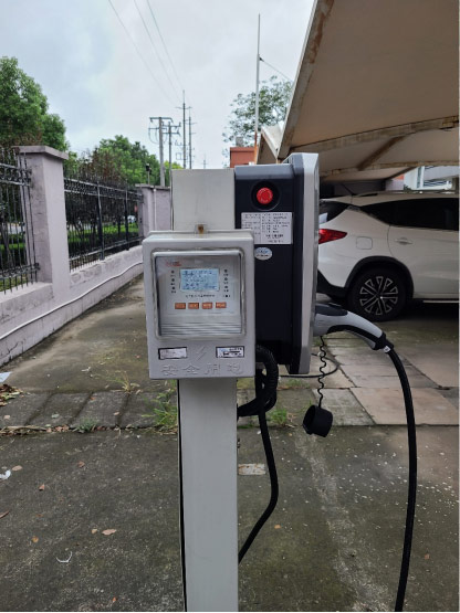 在電動汽車汽車充電樁安裝限流式保護器時建議采用一充電樁一保護器的方式,保護器安裝于充電樁旁邊,如果是戶外,可以將保護器安裝于防水盒中。實際安裝如圖所示。