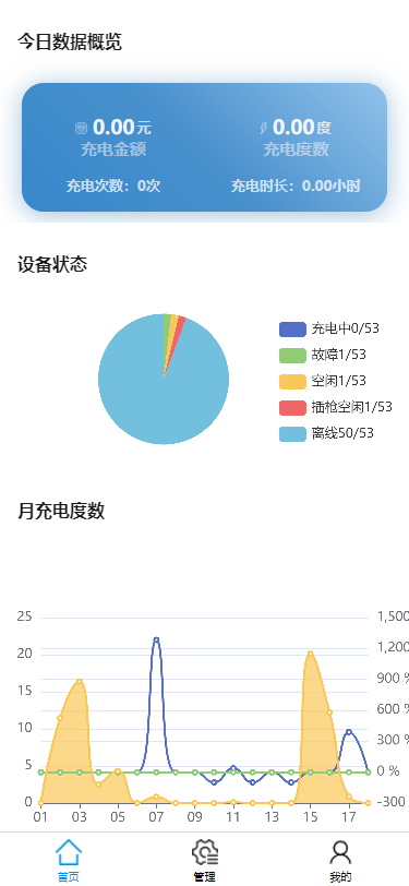 顯示充電樁各回路的狀態及充電數據,統計充電樁今日充電數據、訂單記錄、故障信息,可以查看訂單和故障的詳情。