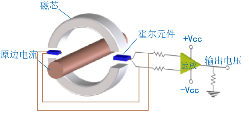 開口式霍爾電流傳感器是在傳統的開環霍爾電流傳感器的基礎上加以改造,根據霍爾效應和電磁感應原理,原邊電流IP產生的磁場,通過磁芯聚磁后,用霍爾感應芯片在磁芯氣隙處感應原邊電流IP的大小和方向;魻柛袘酒妮敵鲭妷,經過信號處理電路,使傳感器的輸出可以反映被測電流的大小。為了提高霍爾開環傳感器的性能,通常使用硅鋼或者坡莫合金作為磁芯的材料。