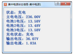 雙擊集中電源設備,則會出現(xiàn)集中電源的狀態(tài)一欄,該欄中顯示此集中電源的工作狀態(tài),主、備電源電壓值。要查看具體信息時,請雙擊狀態(tài)信息欄,可查看詳細工作信息,包括當前輸出電壓值和輸出電流值。