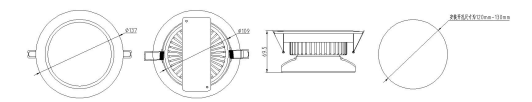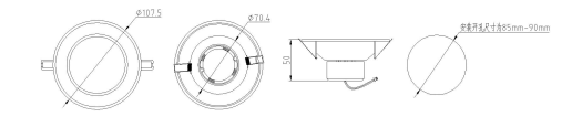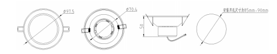 b.嵌頂式燈具安裝:在天花板上開好安裝孔位,相應的燈具開孔尺寸為φ97.5mm(或 107.5),天花 板厚度為 1-20mm。將燈具上的彈簧按圖所示方向撐開到可以塞入安裝孔,保持彈簧張開狀態,將燈具放入安裝孔,松開彈簧,此時彈簧復位,將燈具固定在天花板上,即完成安裝。