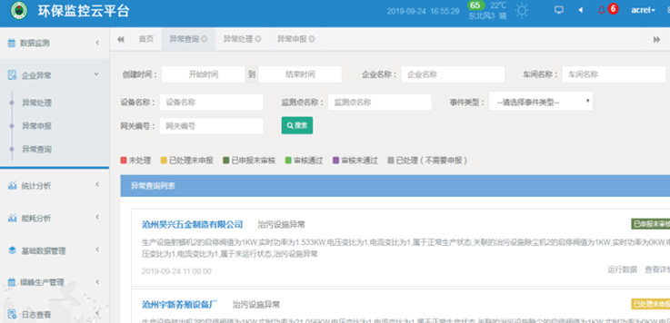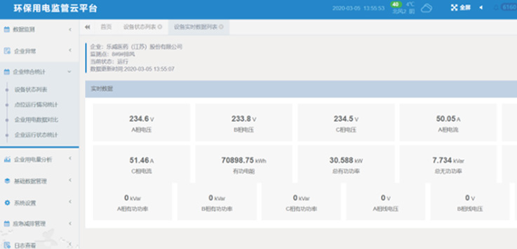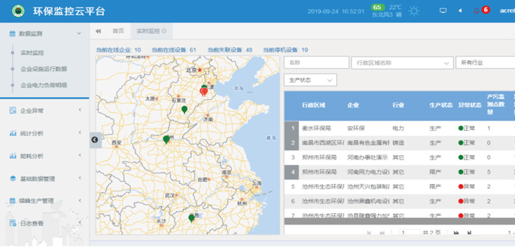 設備狀態分析:統計分企業某個時間段內的產污設備運行、停機,監測設備失聯,可以查看實時上報的數值。