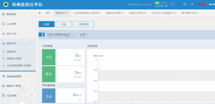 平臺首頁顯示企業概況,用電統計,產污設施運行柱狀圖,治污設施運行柱狀圖,如圖所示: